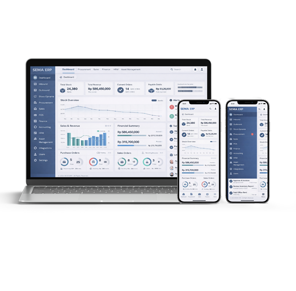 SEMA ERP adalah sistem Enterprise Resource Planning modular yang membantu bisnis mengelola operasional inti seperti inventory, procurement, sales, finance, accounting, HRM, hingga reporting dalam satu platform terintegrasi. Cocok untuk bisnis retail, distribusi, manufaktur, hingga perusahaan dengan multi-gudang dan multi-divisi.